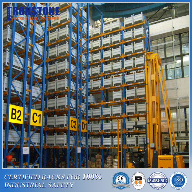 این رباتسیستم های قفسه های پالت انباردارای محدوده ارتفاع 40 متری است و به طور خودکار کنترل می شود. پالت ها می توانند "یک عمق" یا "دو عمق" مرتب شوند و توسط جرثقیل های قفسه نگهداری شوند.جرثقیل ها توسط یک ریل نصب شده در کف و دارای یک ریل راهنمای بالا هستند که آنها را در بالای استخر ثابت می کند.